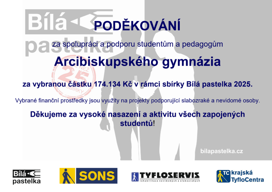 Na podzim se uskutečnila sbírka Bílá pastelka do které se žáci a žákyně Arcibiskupského gymnázia pravidelně a rádi zapojují. Tentokrát se zúčastnilo 40 studentů a studentek napříč ročníky a to s velkým úspěchem!