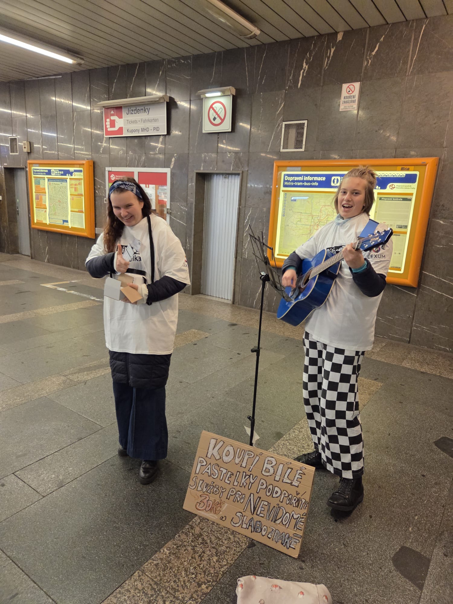 „Dne 14. 10. jsme se vydaly brzo ráno na zastávku metra I.P. Pavlova, kde jsme celý den vybíraly na sbírku Bílá pastelka pro pomoc nevidomým a slabozrakým. A jelikož už jsme měli vyzkoušené, že pozornost kolemjdoucích nejvíce získáme zpíváním, vzaly jsme si s sebou kytaru a celý den lidem zpívaly písničky z jejich mladí. Myslím, že nikdy jsme nestihly tolik krásných rozhovorů o pomoci druhým a o důležitosti takových projektů. Rády bychom zmínily pár momentů, které nám v hlavě utkvěly do dnes.
